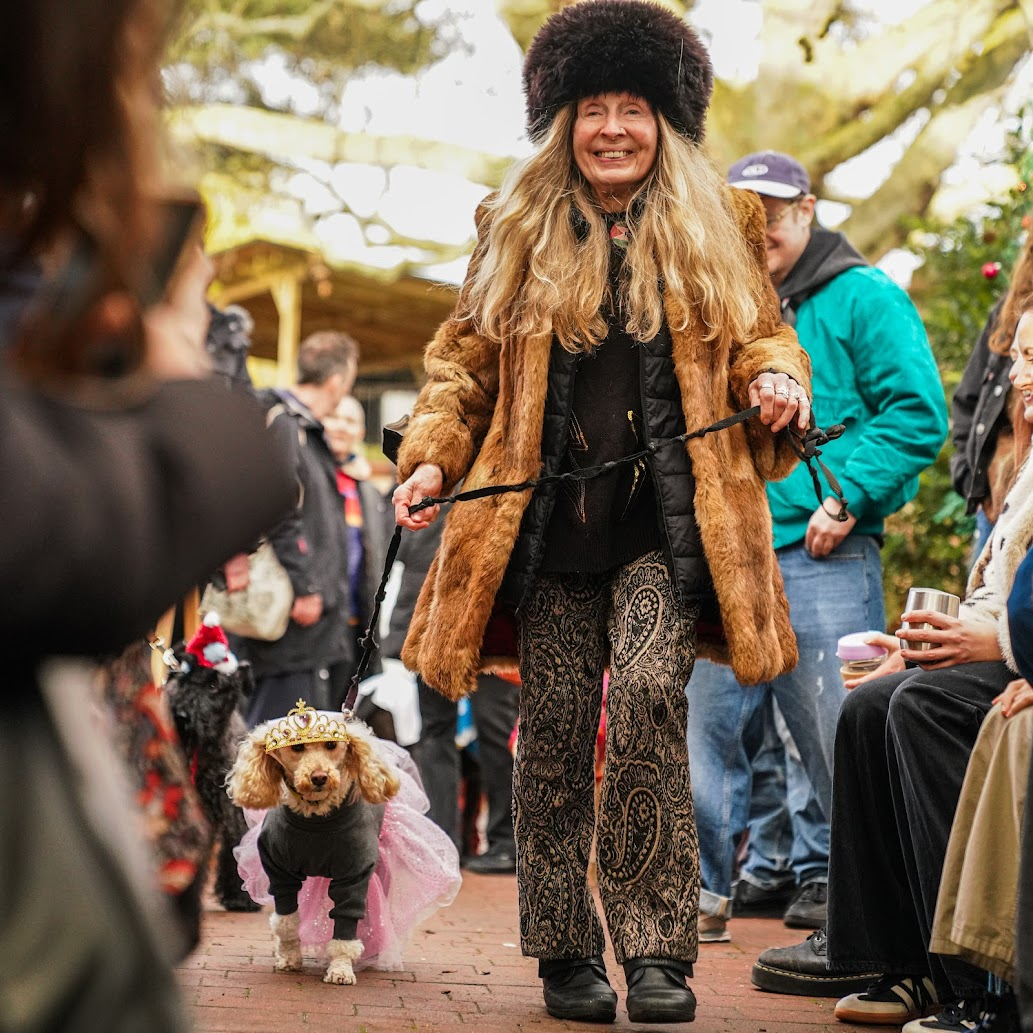 A woman strides down a makeshift concourse in an Afghan coat, her flowing blonde hair dwarfed by an enormous Russian fur hat. Trotting alongside her, more cautiously, is a dainty little poodle in a tiara and a pink tutu. The duo look fantastic, but they are not the eventual winners of the “Family Resemblance” prize, perhaps because their aesthetic sensibilities — Disney princess and glamorous villain in a John le Carré novel — are too incongruous.