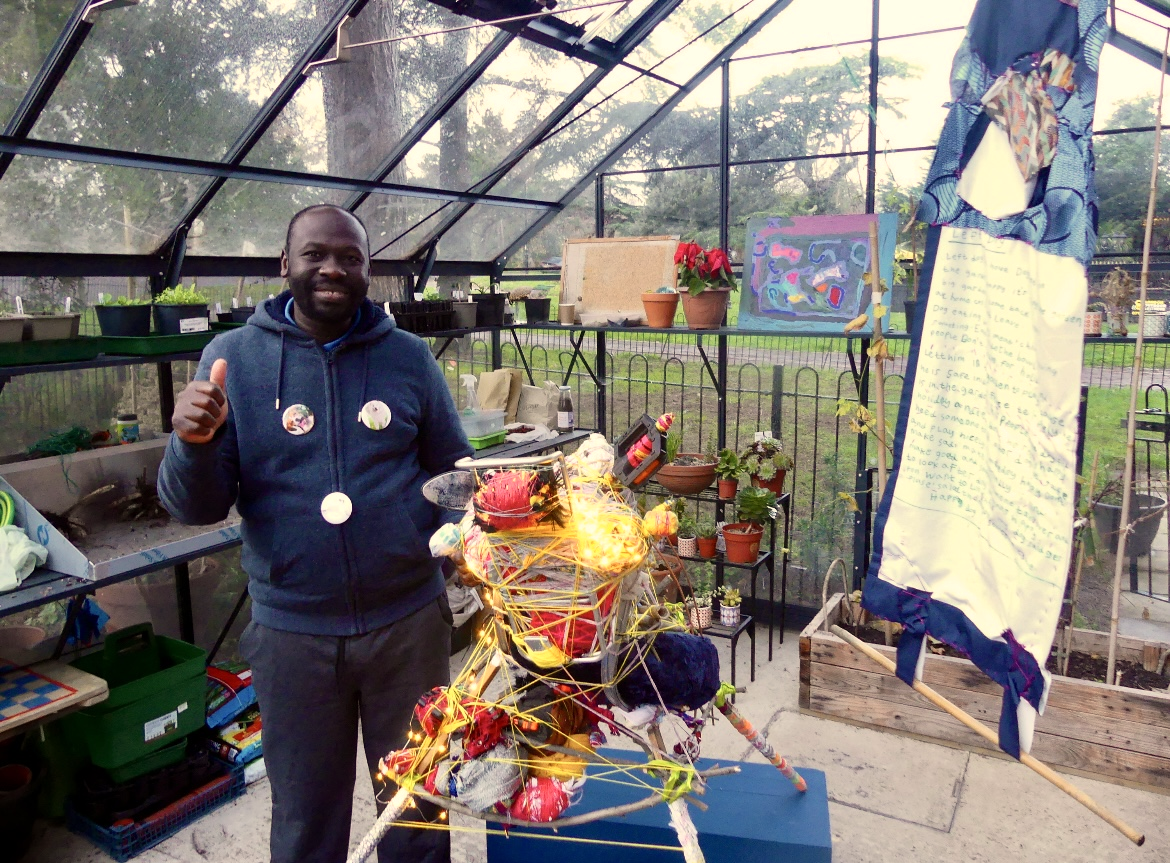 While exploring the museum’s gardens, I come across a large-scale sculpture of a dog, exhibited in the greenhouse especially for today’s event. This is the work of Andrew Omoding, a resident artist at ActionSpace, an independent charity which supports artists with learning disabilities (one of its members, Nnena Kalu, this year won the Turner Prize.). “Dog” is a vibrant and intricate piece created with found objects and discarded materials, such as bicycle parts, branches and twine. While Omoding has never owned a dog himself, he “loves them very much — they’re very friendly and playful.” That affection is evident in the work: contained within its elaborate structure are dog toys, warm fabrics and a bone, and it’s displayed alongside a short story about the sadness and isolation of a dog abandoned at home by its owners. He wrote it, he tells me, to remind people to treat dogs well, to play with them nicely and to take them on holiday.
