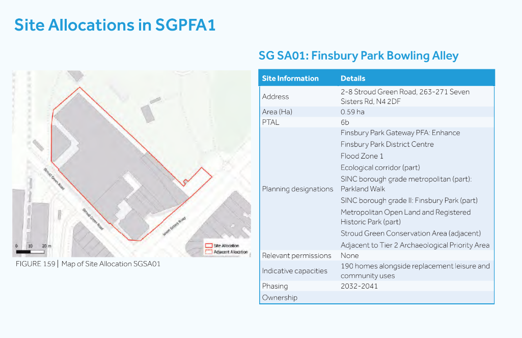 Top line: Haringey’s newly released draft Local Plan contains a proposal to build up to 190 flats on the site of Rowans, the iconic bowling alley opposite Finsbury Park station.