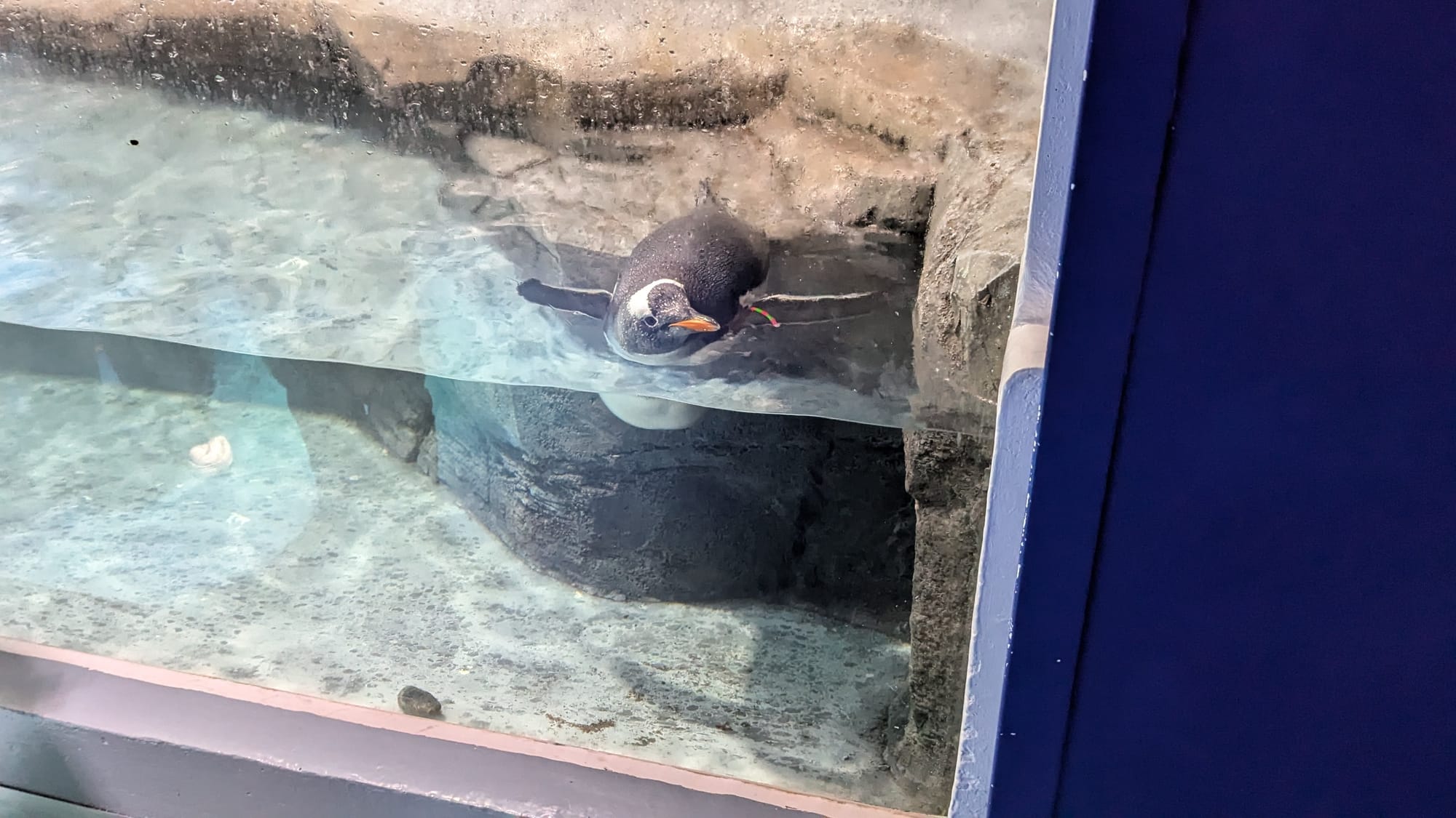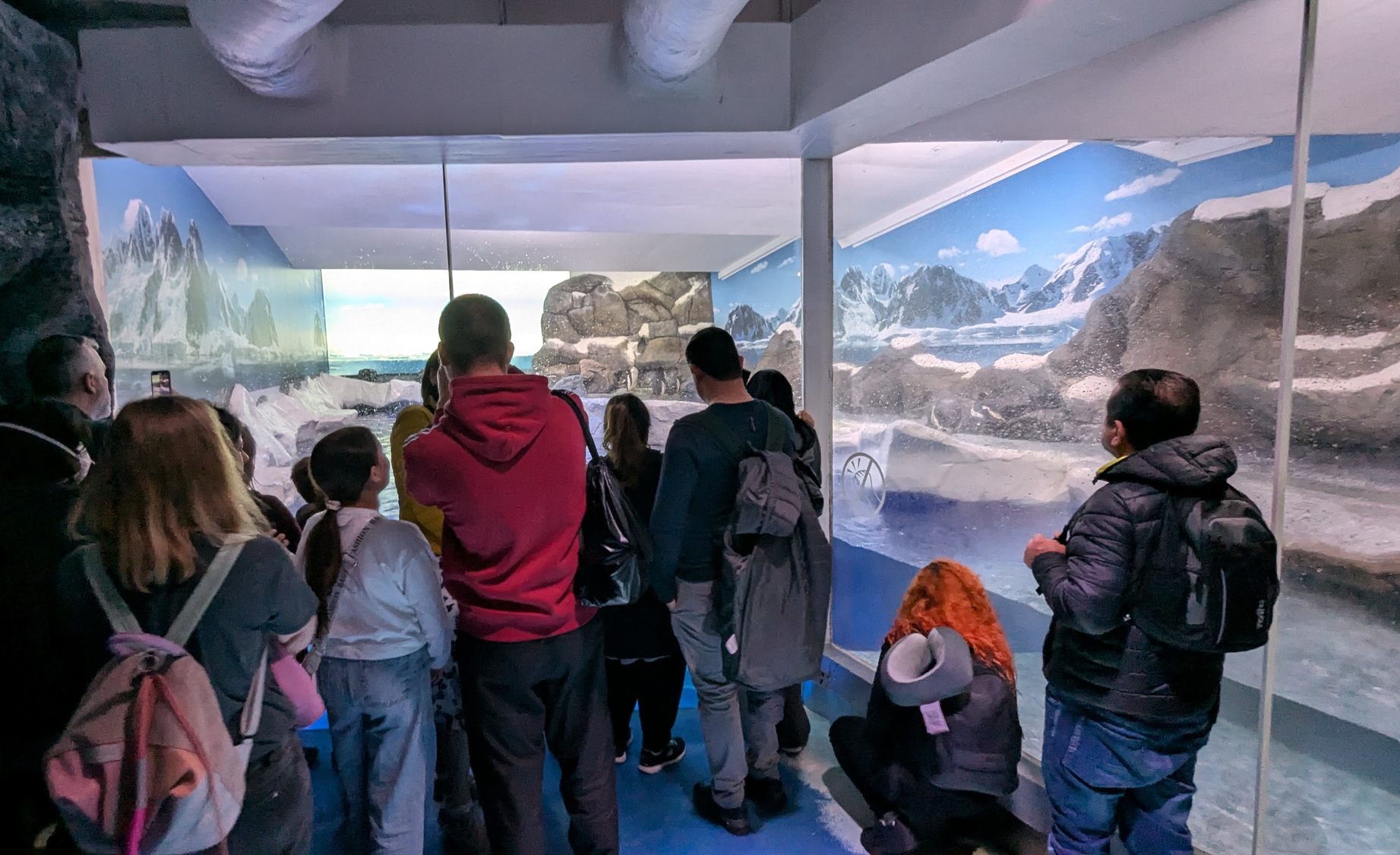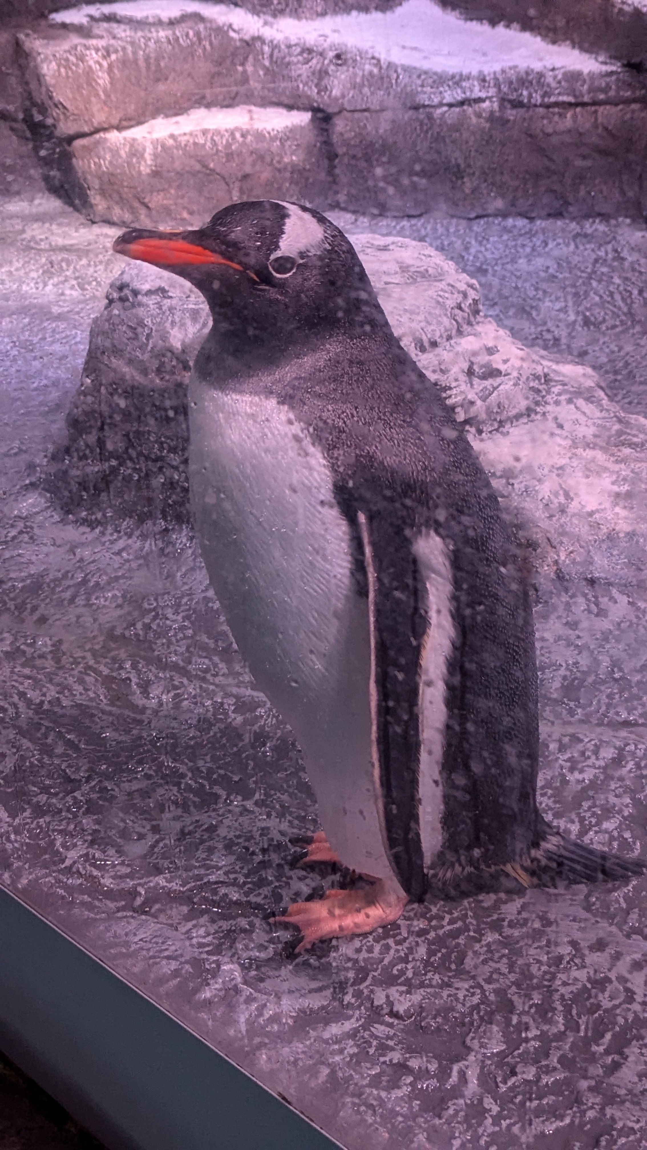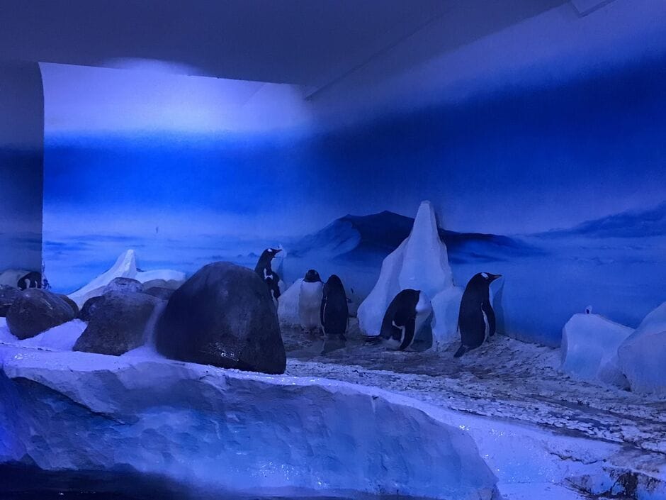 You can hear the speakers mimicking the natural calls of the penguins long before you see any of them. Initially, the crowds block any view through the windows. Only when it thins slightly do I get a sense of daily life for the Gentoo 15. Most of the colony are gathered in the far end of the enclosure as far from the prying eyes of the crowds as possible. But there’s little privacy to be had in such a wide open space. It’s breeding season, so a handful of the penguins are sitting on nests. The rest are mostly standing, unmoving, looking at the faux rocky edifice and painted antarctic murals that line their enclosure. I lock eyes for a fleeting few seconds with one of the few Gentoos not exiling itself to the far corner; he starts pecking frantically in the direction of a toddler that’s repeatedly tapping on the glass.