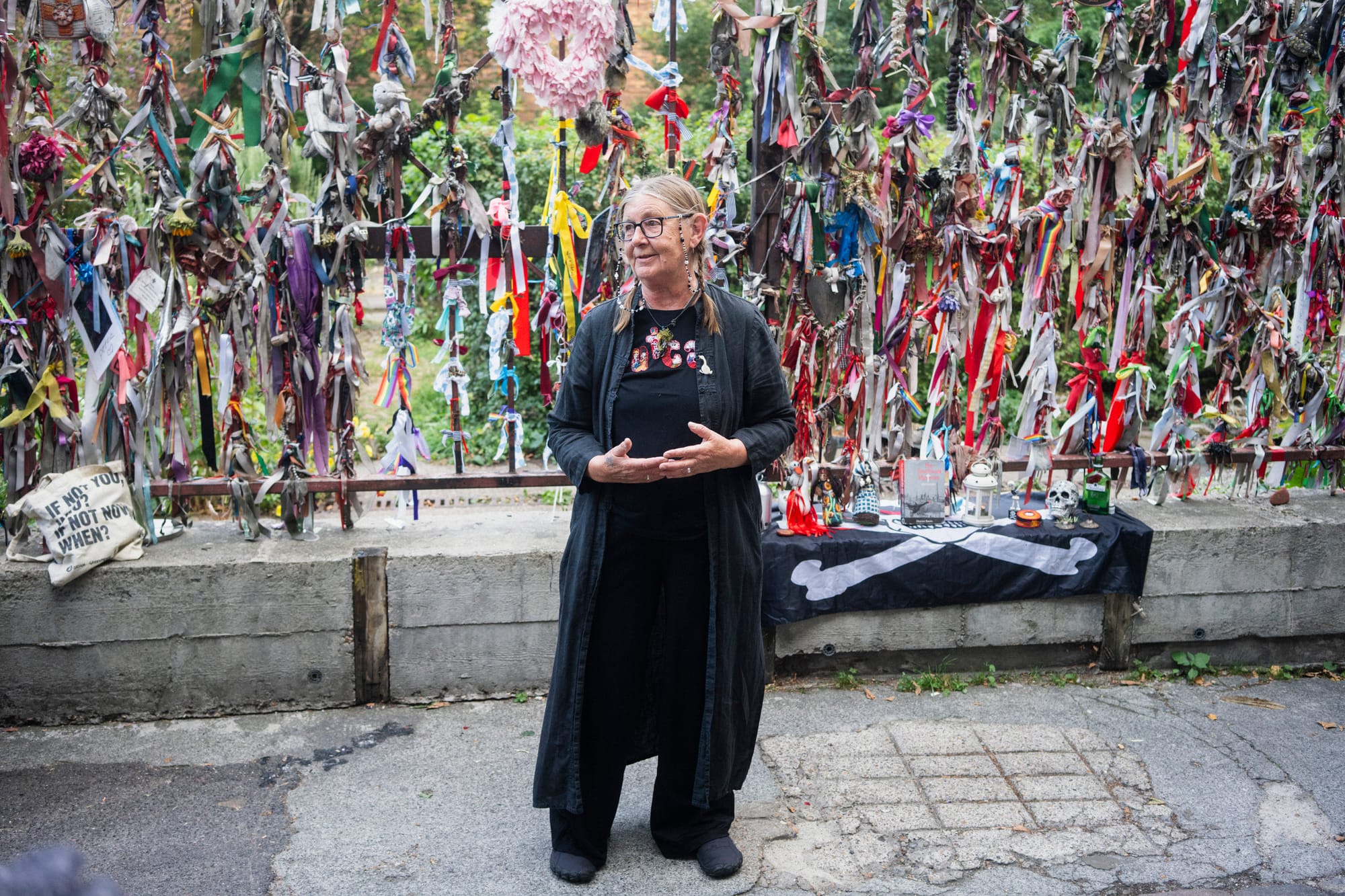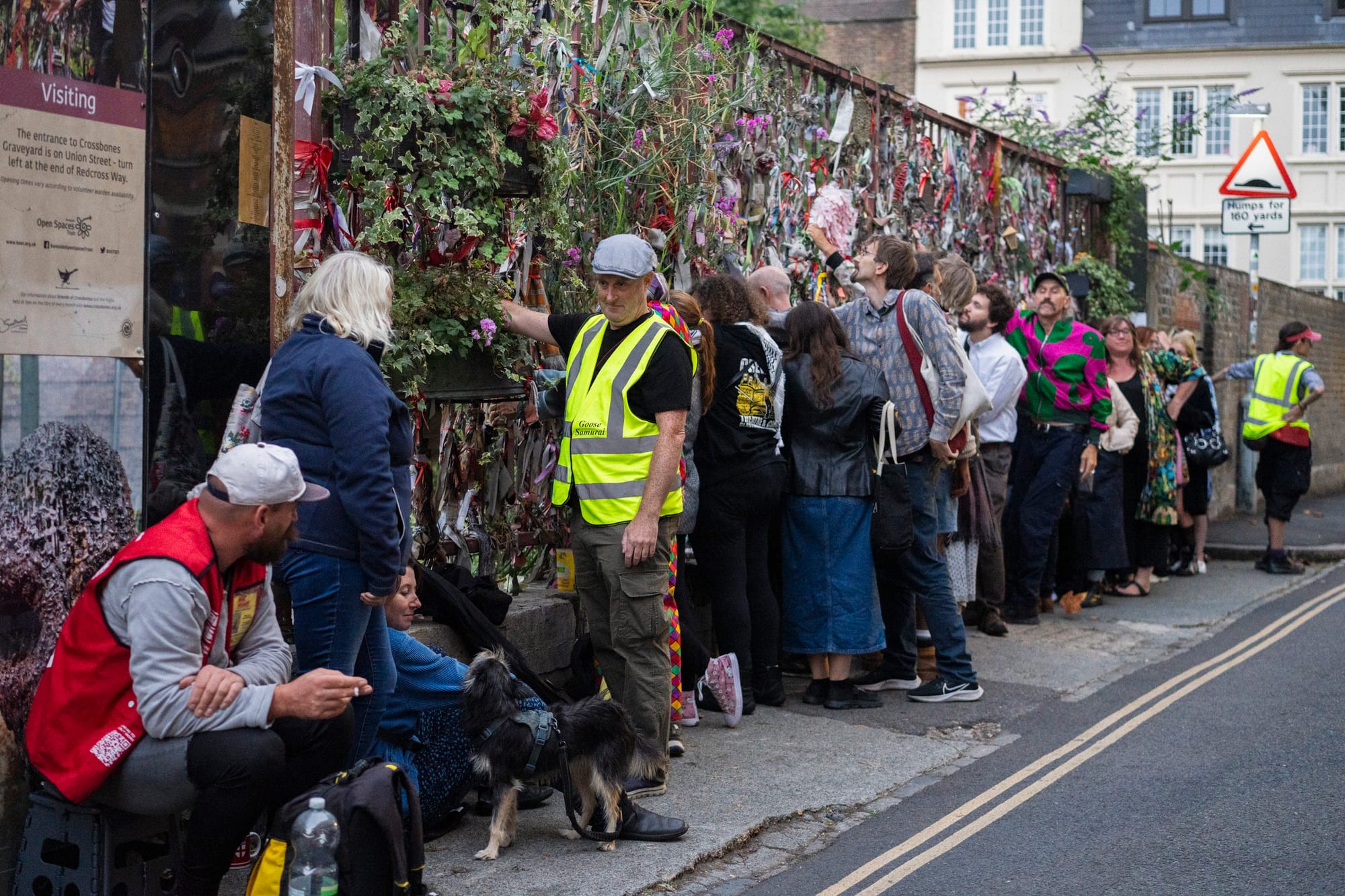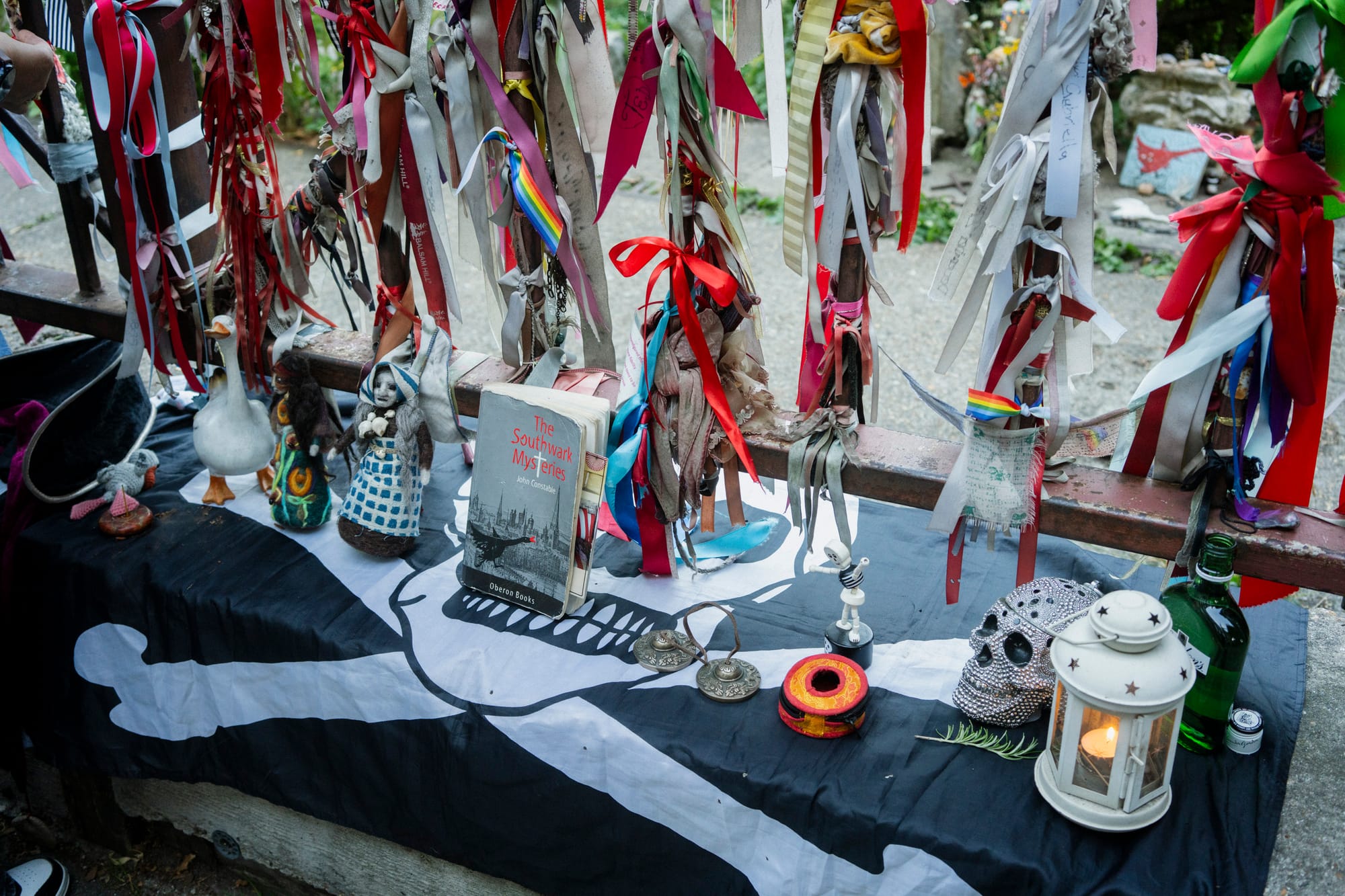Speaking to us in front of the cemetery gates, ribbon-wreathed and heavy with football scarves, laminated photographs, soft toys and dried flowers, Dave 500 says he can’t remember precisely how long he has been coming to the Crossbones Vigil. He reckons it’s “about 13 years now, maybe 14”. A short man in his early 70s, he addresses us with neither flamboyance nor nerves; if there is any hint of anxiety, it is manifested only in how firmly his baseball cap is pulled on to his head, as if, despite the still evening air, it might blow away.