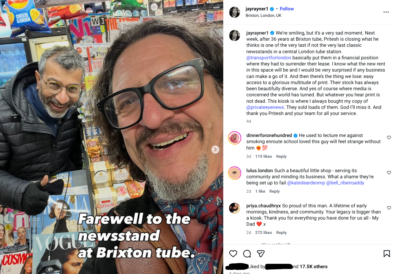 As for today, we headed to the beloved Brixton tube news stand that went viral after Financial Times food critic Jay Rayner revealed that it'd been forced to leave after a rent rise from TfL to speak to co-owner and operator Pritesh Patel. Read the details of how much money the transport authority was asking for, as well as what Pritesh had to say about the desperate situation he's been left in: “I'm open to anywhere and anything... I just need to work."