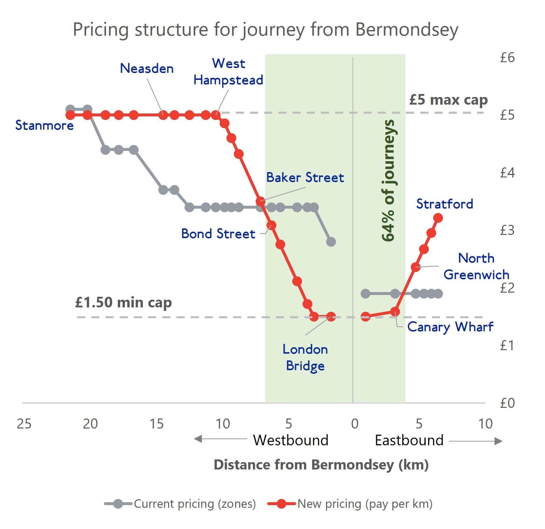 For one last time, let’s look at our passenger setting off from Bermondsey. The graph below shows the distance they travel to each station, westbound or eastbound, and the amount they end up paying under the old zone system (Jubilee Grey) and new pay-per-km system (The Londoner Red, not to be confused with Central line Red).