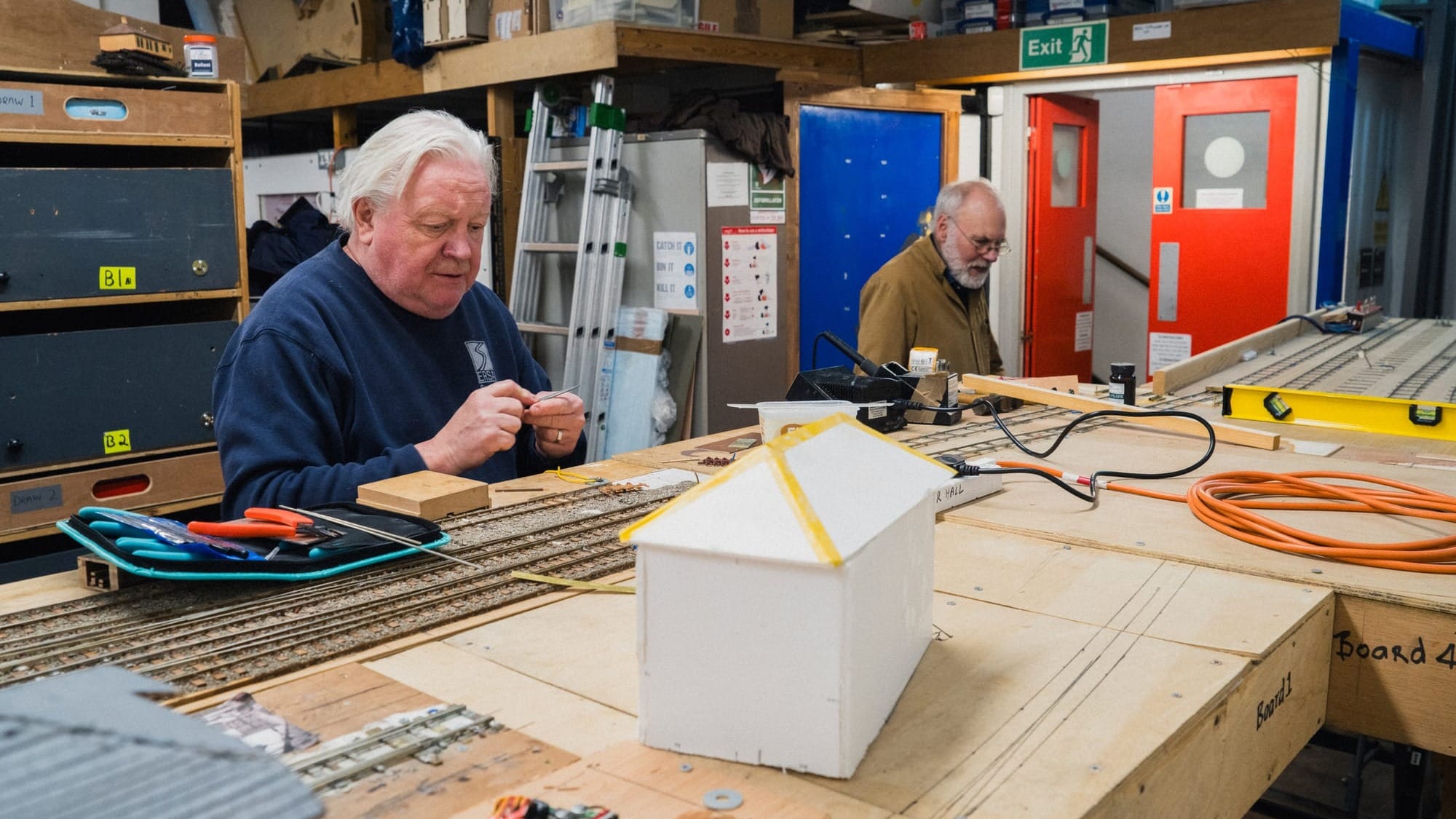 It’s during a second visit to the MRC, some weeks later, that I get to see this in practice. I join Peter, George, and Paul as they work on an under-construction model of Bow Junction, this time set in 1910, the year of the club’s founding. Unlike Copenhagen Fields, this layout is very much a construction site, with MDF, glue and wires poking out between freshly laid tracks. Over the sound of sawing and deliberation about measurements and gauges, Peter, a retired civil engineer and project lead for Bow Junction, uses language I’ve become familiar with. “It’s like a stage, really,” he says, our bodies facing the shell of Bow Junction’s train workshop. “Imagine you’re in the theatre; it’s like sitting in the audience.” For all the fastidious, labour-intensive work of wiring, electrics, painting and research, the endeavour is ultimately a spectacle, designed to be displayed and seen.