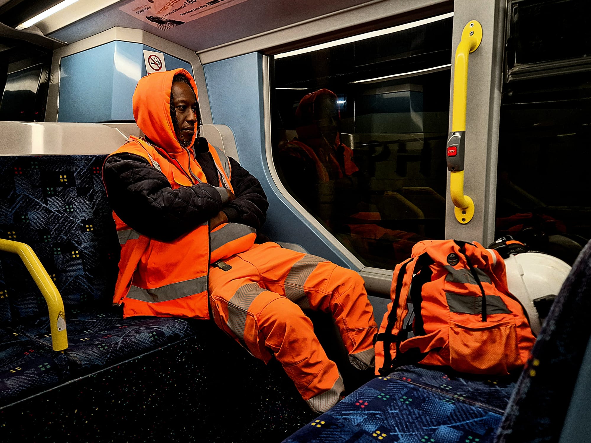 Kay, who I meet on 131 to Hither Green, is one of these men. He’s sitting in the back corner of the bus, arms folded, decked out head-to-toe in fluorescent orange. He’s on his way back home to Bromley from Arnos Grove, where he’s been on a rail track maintenance repairs job for Network Rail. A long commute, considering his shift is usually just a few hours long — squeezed in between 11pm when the trains finish for the night and 3am, when they prepare to start up again.