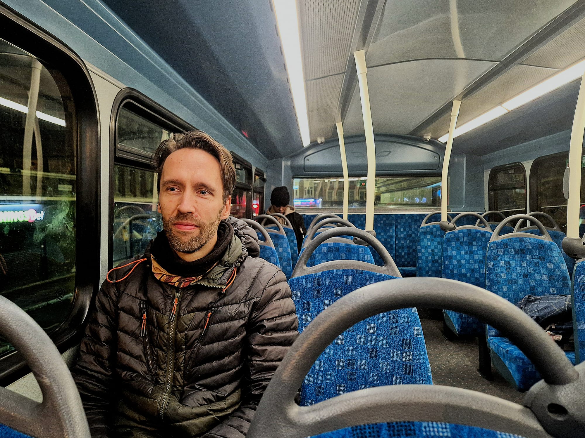 When they board the N2, the two colleagues take seats at opposite ends of the bus, and put their headphones on.