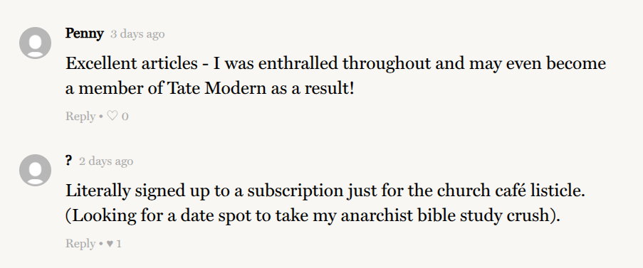 - Friday saw the publication of our latest culture edition, where we took you through the capital’s best church cafes, a guide to the London Film Festival and a review of the latest Tate Britain exhibition. If you, like one of readers, are “looking for a date spot” to take your “anarchist bible study crush”, then this could be one for you!
