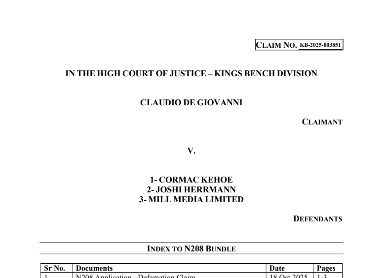 Di Giovanni doesn’t have a valid case against us and has never identified any factual errors in the piece. He is trying to force us to take down a story that he knows is true. The investigation was deeply sourced by our freelance reporter Cormac Kehoe and edited by two senior editors at Mill Media, the independent media company that publishes The Londoner. It was reviewed by our excellent lawyers.