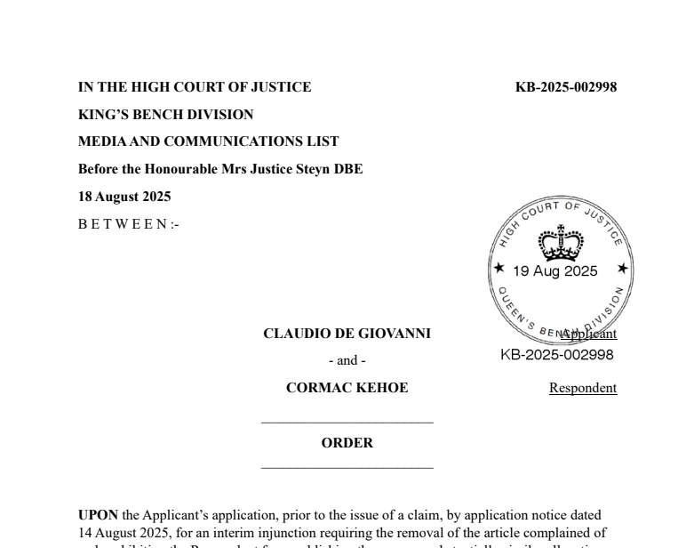 A few days after we published our story, Di Giovanni emailed copies of papers that appeared to show that he had brought a personal claim for £5,000 against Cormac in the county court. There was more: if The Londoner did not remove the article by 11 August, Di Giovanni wrote, he would escalate his claim to the high court and sue Cormac personally for defamation to the tune of £250,000. He simultaneously offered to “drop all legal claims entirely if the article is taken down within the next 24 hours” (we declined this offer).