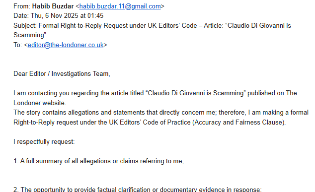 When we failed to unpublish the article, Di Giovanni did as promised, and escalated his lawsuit a week later. “I am formally claiming £250,000 in damages for defamation, aggravated harm, and loss of business,” he wrote in his county court filing.