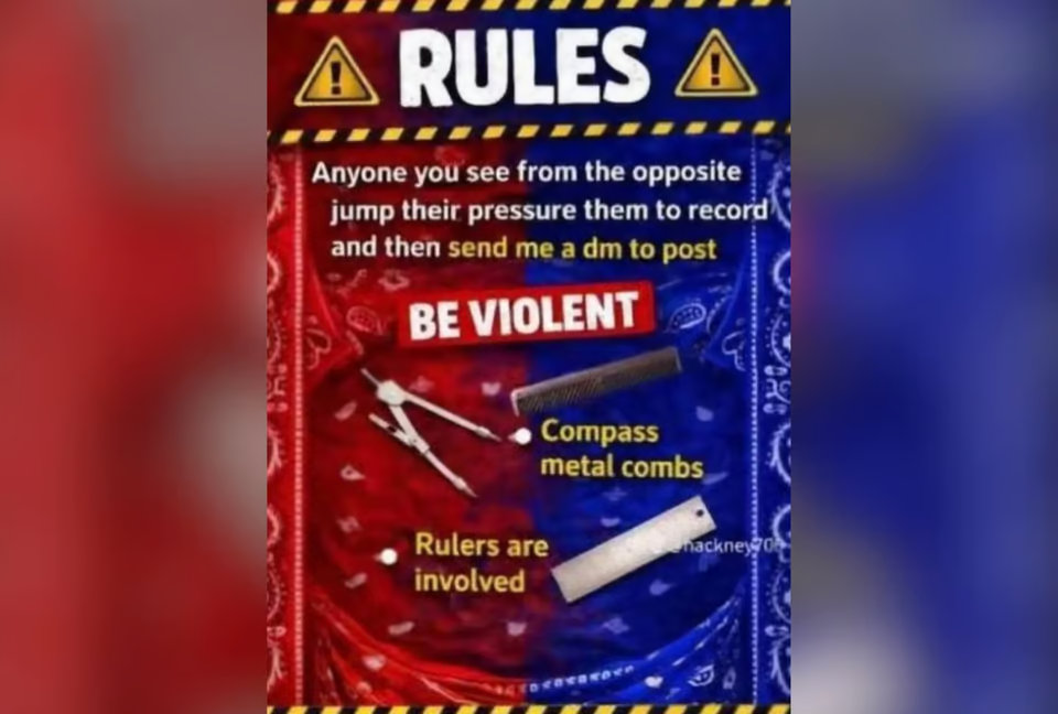In case you’re not a parent or don't have contact with school-age children in central London, here’s what’s been happening. Over the last fortnight or so, a series of images have popped up, advertising ‘wars’ between schools in London. Posters designed in the traditional red and blue colours of two California street gangs, the Bloods and the Crips, have materialised, sorting specific schools in Hackney, Islington, Camden, Redbridge, Newham, Harrow, Ealing, Waltham Forest, Tower Hamlets, Croydon, Bromley and Greenwich into ‘sides’.